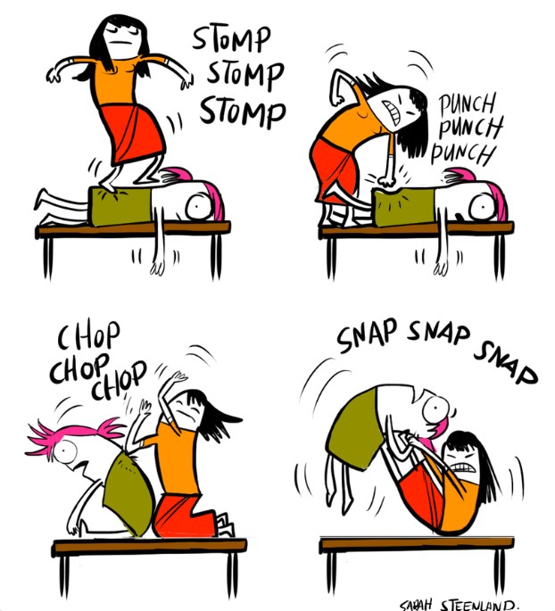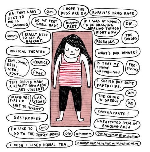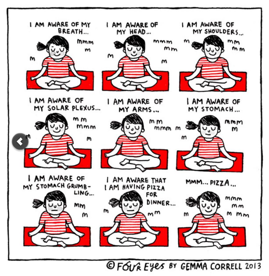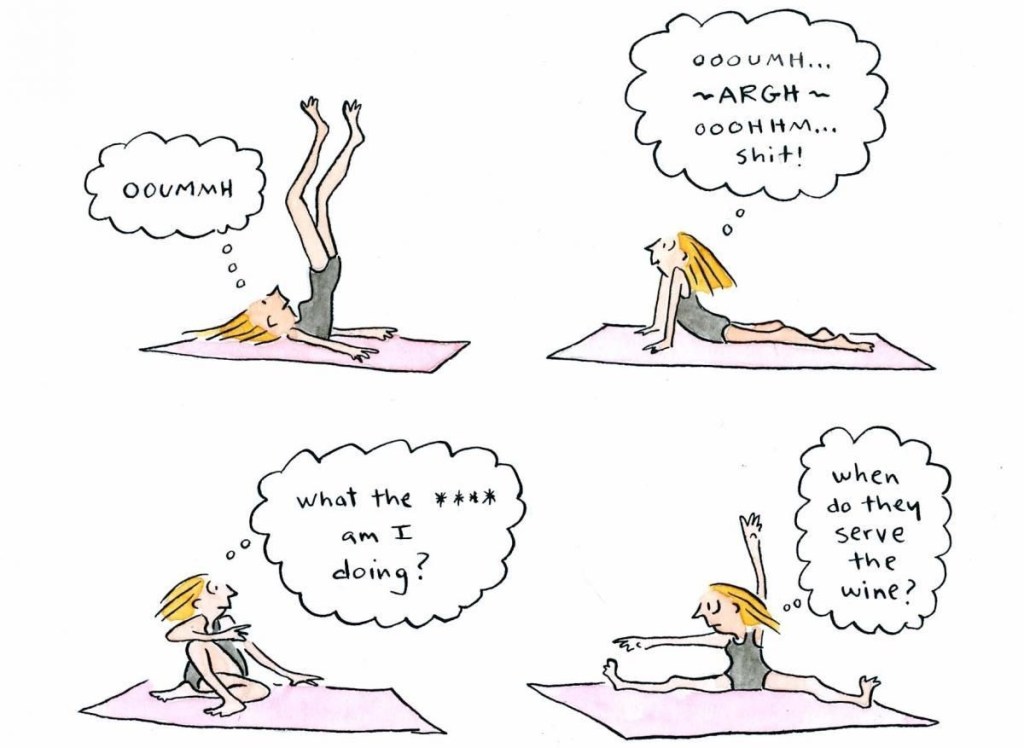 I desperately want to be that flexible, serene, beatific yoga poster girl with ironing-board abs – I really do. That said, between my lack of flexibility, questionable coordination and the tendency of my brain to short-circuit the moment the teacher reels off more than one instruction at once, it may be time to accept that this simply isn’t my spiritual or physical path. I don’t know the yoga-sceptic cartoonist below, but something tells me we’d get on a storm in real life… 😉