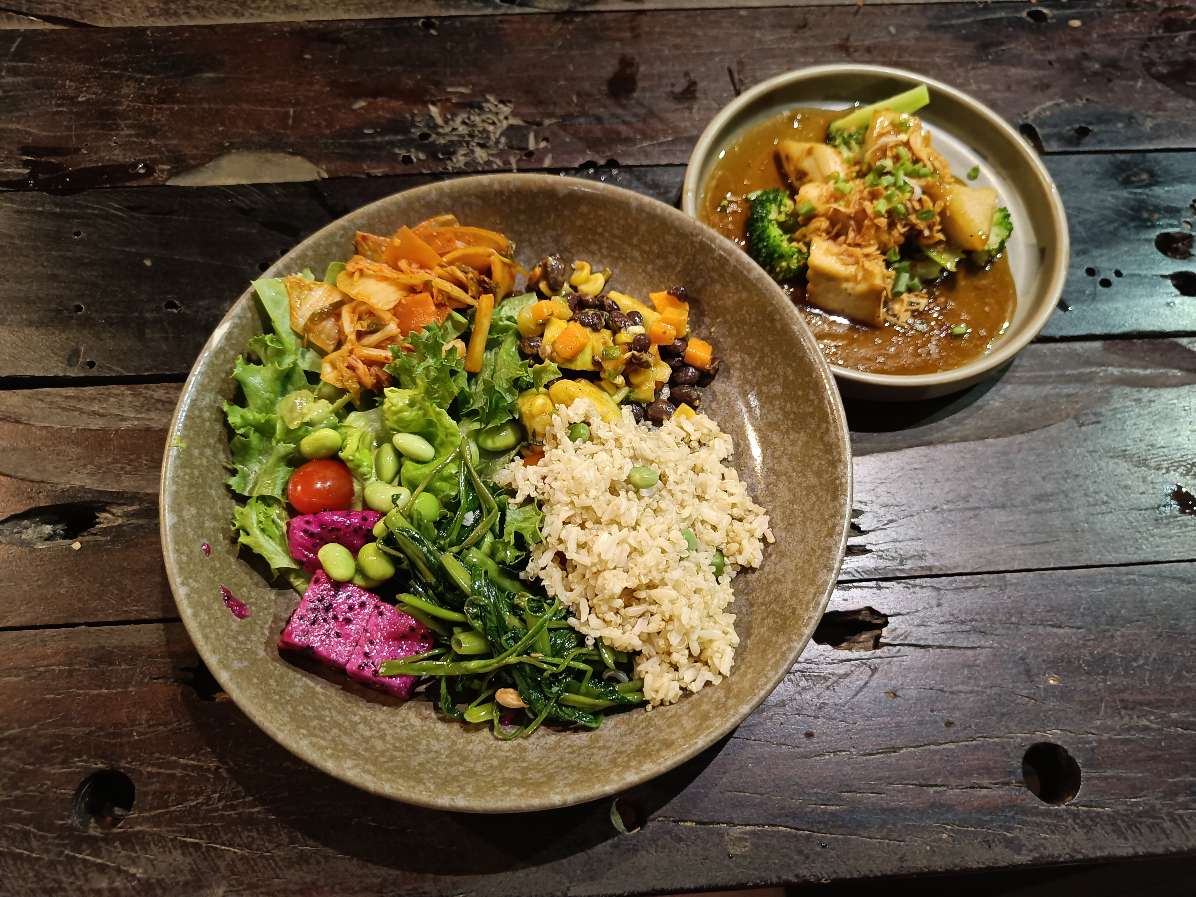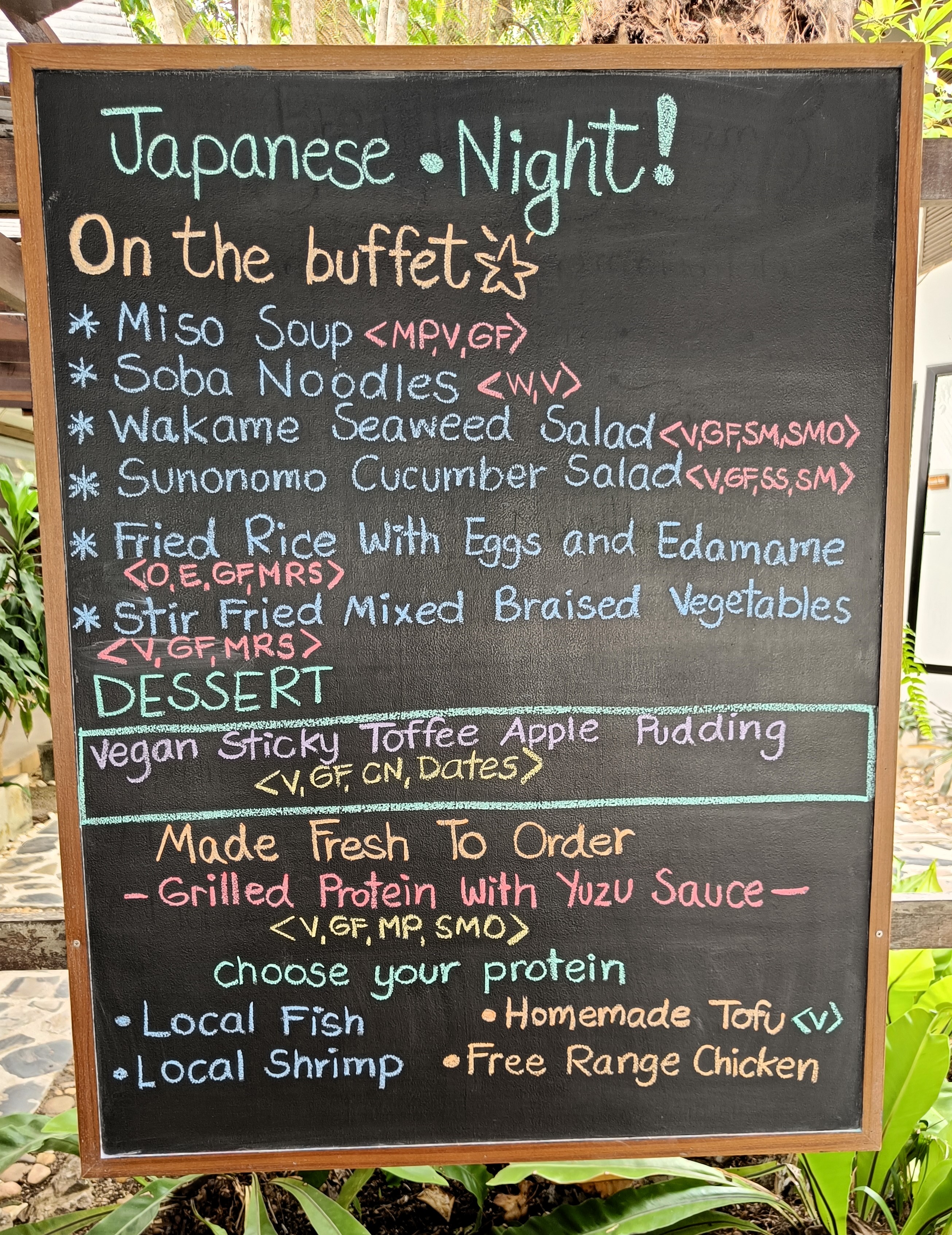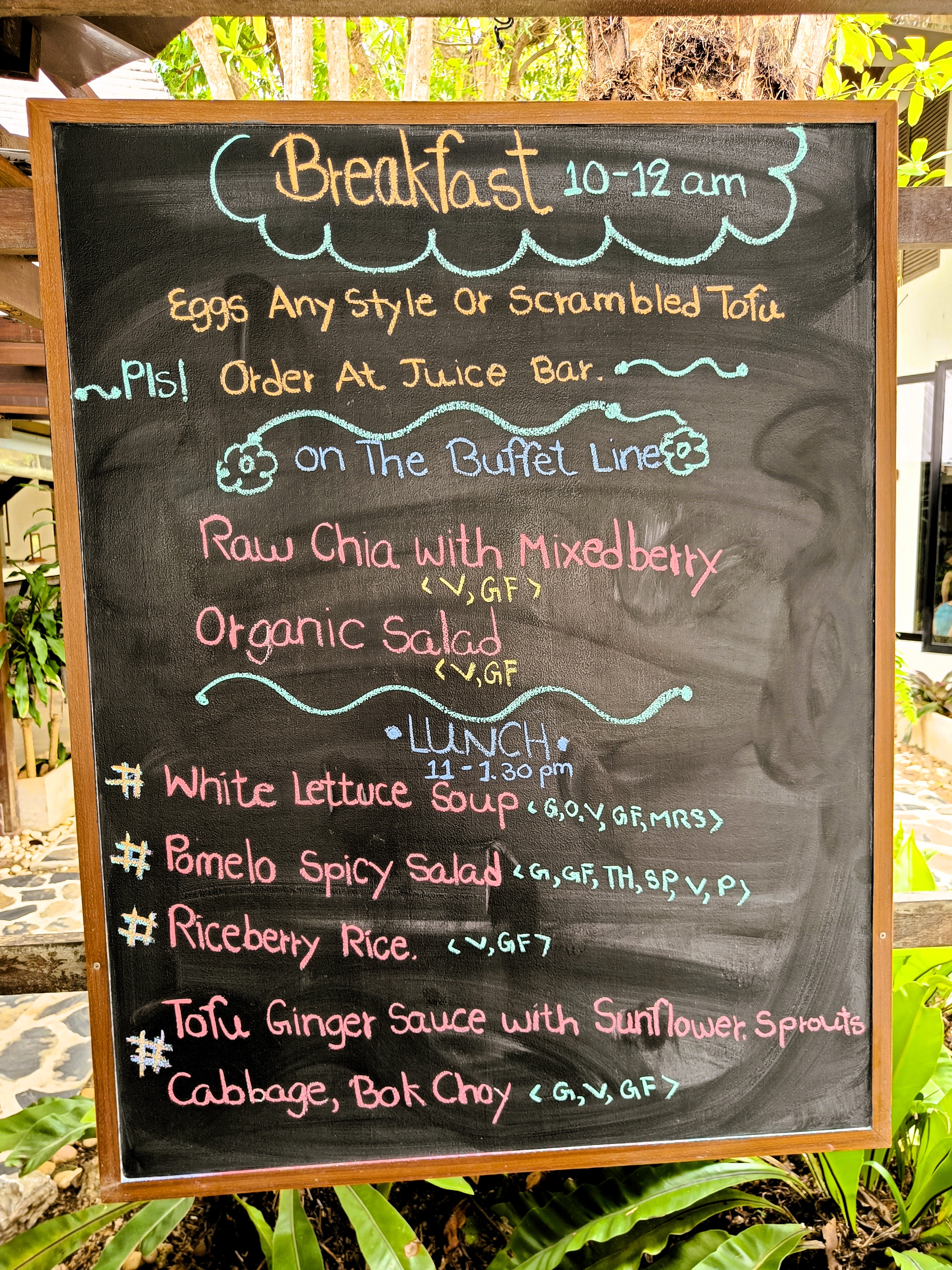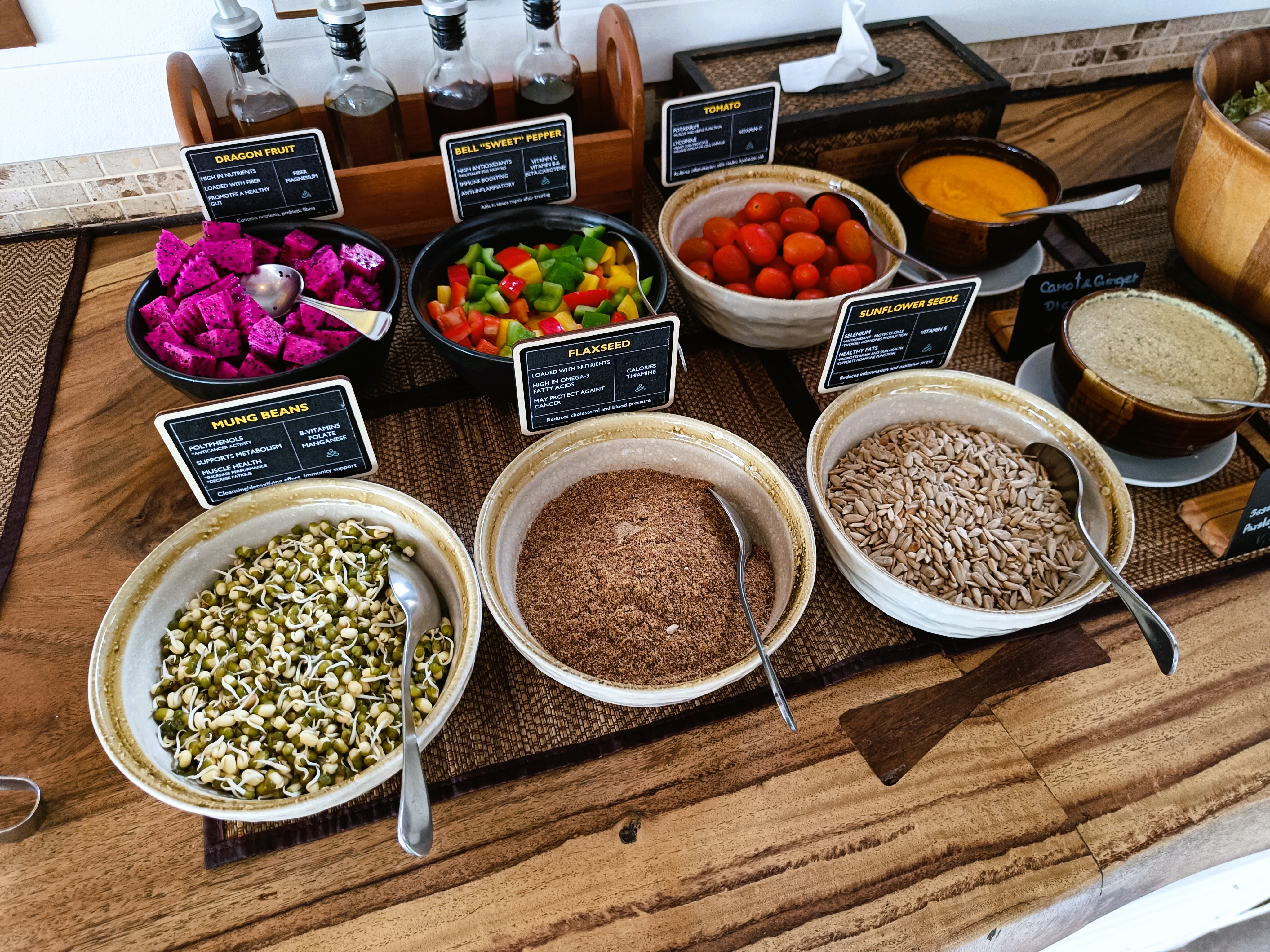 * Apple, dragon fruit, melon, papaya, lime, coconut, pineapple, cantaloupe, banana, strawberry, orange, dates, mango, watermelon, lettuce, spinach, tomatoes, sweetcorn, pak choi, baby corn, aubergine, daikon, carrot, broccoli, beetroot, button mushroom, shiitake mushroom, peas, snow peas, pea sprouts, mange tout, beansprouts, red pepper, celery, cucumber, lotus flower, squash, red cabbage, green beans, kale, cauliflower, seaweed, spring onion, black bean, red bean, mung bean, edamame, chickpea, tofu, brown rice, quinoa, Job’s tears, oats, cashew nuts, peanuts, flax seeds, sunflower seeds, sesame seeds, pumpkin seeds, Thai basil, kefir leaf, rosemary, dill, chives, ginger, garlic, chilli, galangal, turmeric, cardamom, anise, cinnamon, cloves, black pepper, tea, coffee, cocoa, apple cider vinegar and extra virgin olive oil.