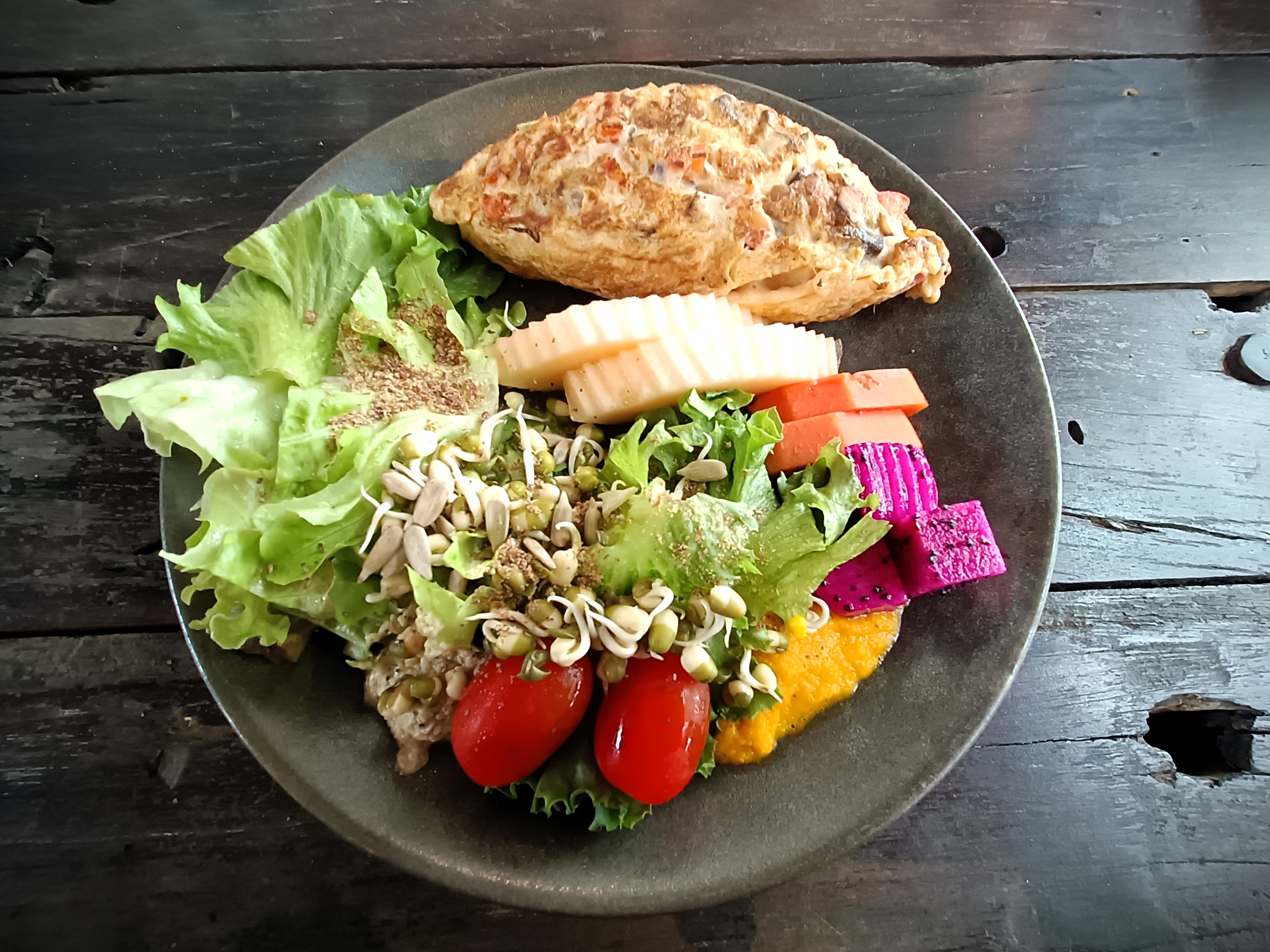 So far, the plant count consists of (in no particular order): apple, dragon fruit, melon, papaya, lime, coconut, tamarind, lettuce, tomatoes, sweetcorn, pak choi, carrot, broccoli, beetroot, button mushroom, shiitake mushroom, peas, snow peas, pea sprouts, mange tout, beansprouts, red pepper, celery, cucumber, lotus flower, squash, Thai basil, rosemary, dill, chives, ginger, garlic, chilli, brown rice, quinoa, Job’s tears, black bean, red bean, mung bean, edamame, tofu, seaweed, flax seeds, sunflower seeds, sesame seeds, pumpkin seeds, cardamon, anise, cinnamon, cloves, black pepper, tea, coffee, extra virgin olive oil and – last but not least – apple cider vinegar.
