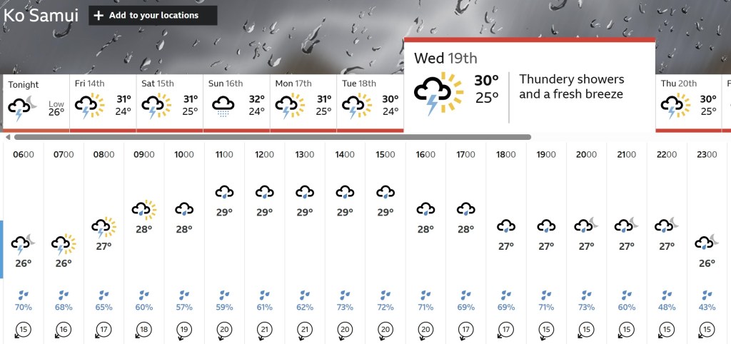 * Or maybe not. Apparently it was mostly sunshine until I rocked up (as also confirmed by my obsessive monitoring of Koh Samui weather cams in the run-up to this trip). I’d say I have bought the weather with me, except it was a sunny autumn in the UK when I left… At this rate, it seems I might be the only person in recorded history to come to Thailand and promptly develop a case of Seasonal Affective Disorder. Urrghhh.