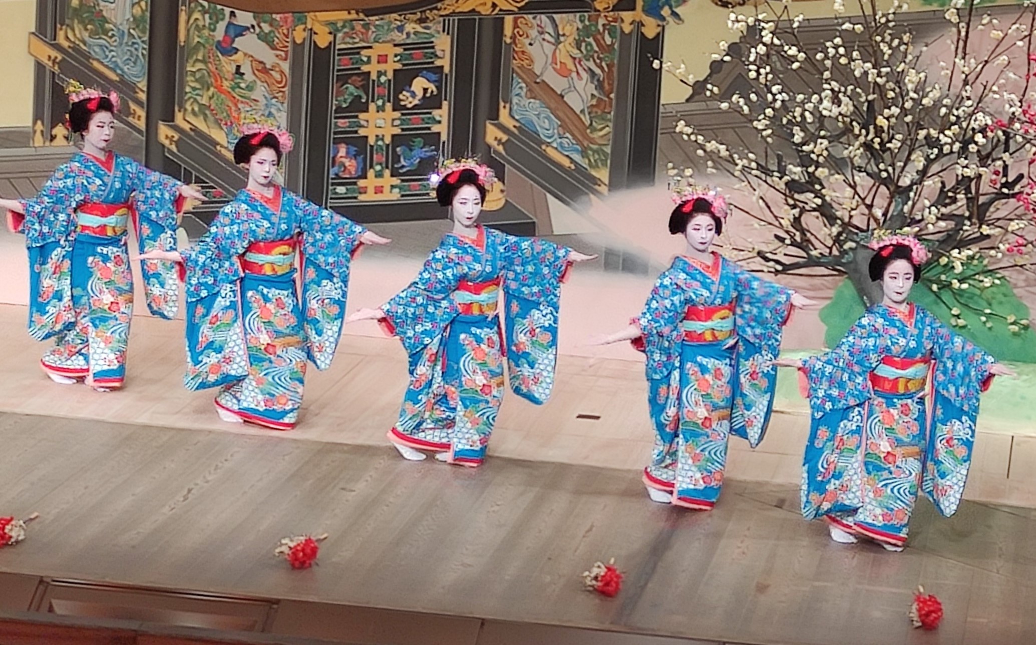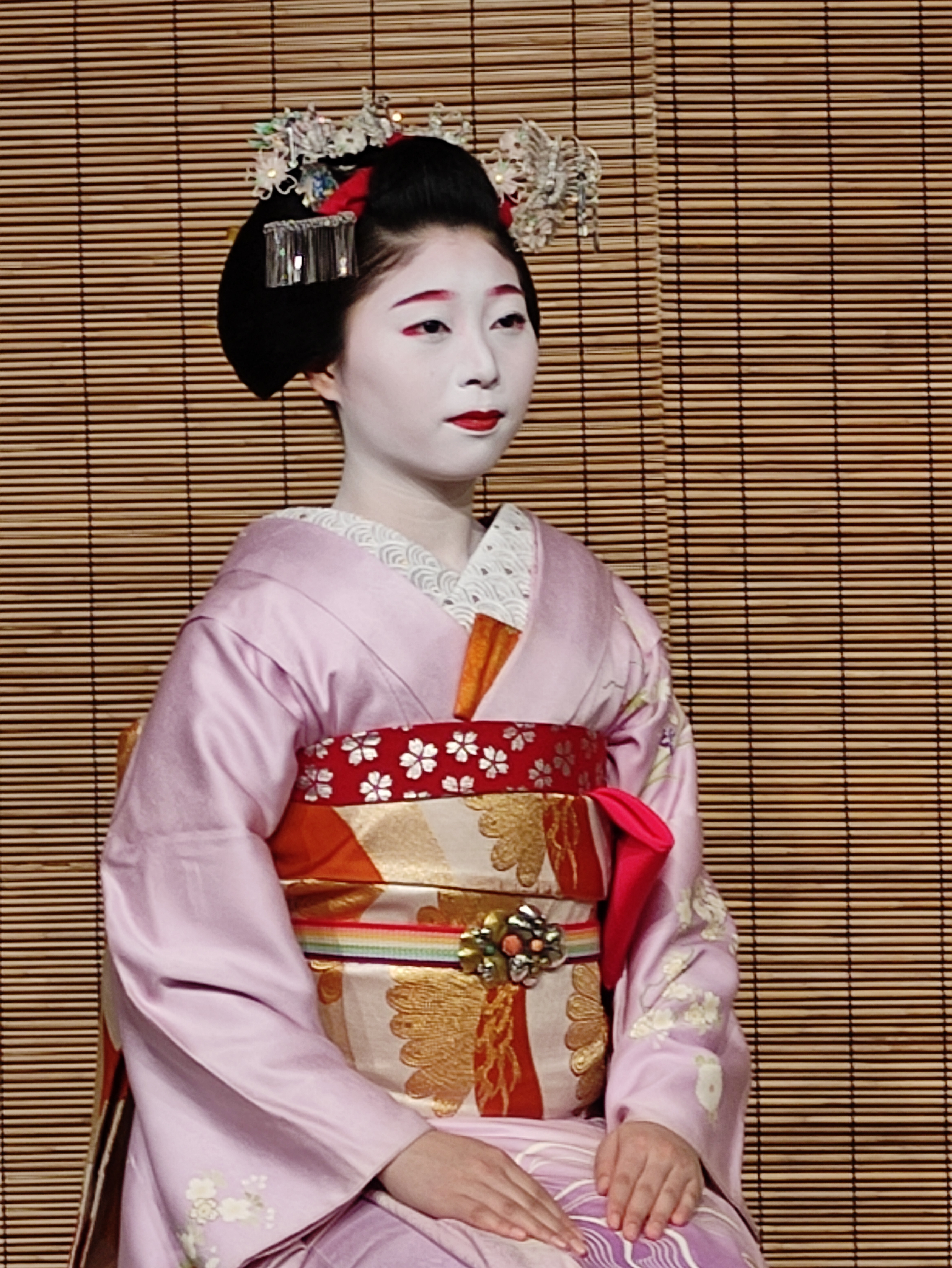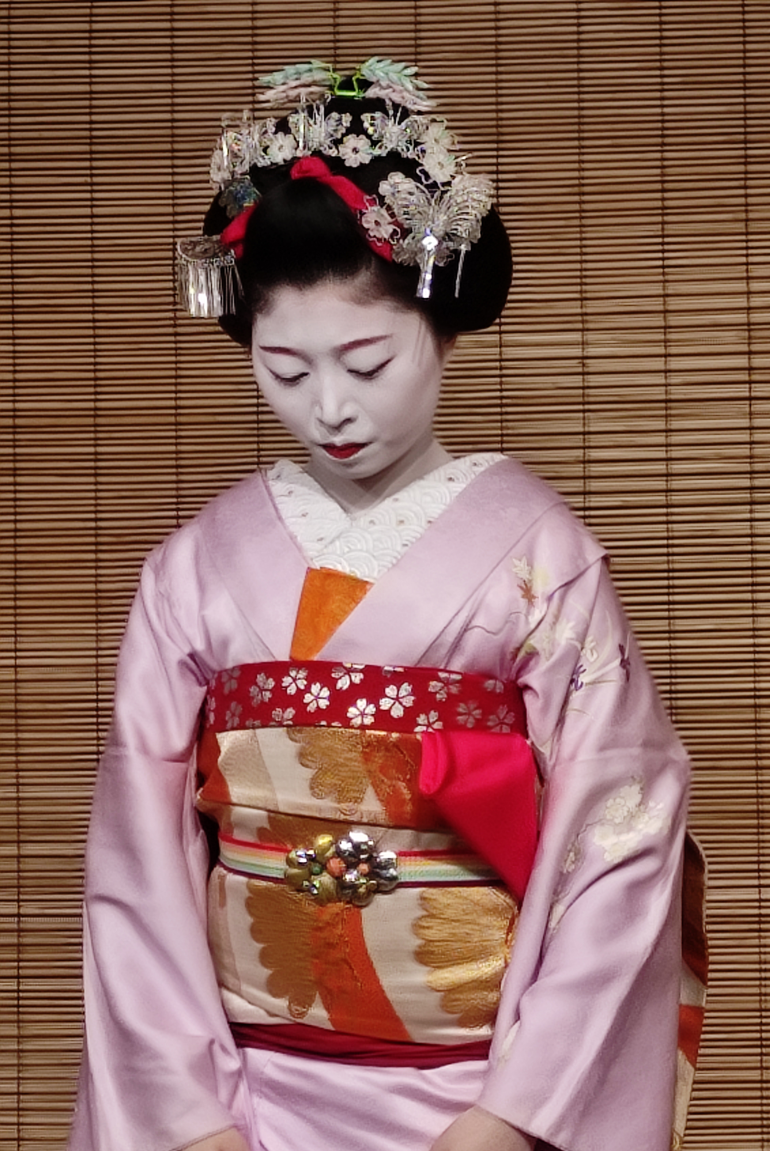 Anyway, moving swiftly on, let’s take a look at some real geisha instead. In the afternoon, I went to the Gion-kōbu Kaburenjo Theater to observe a Japanese tea pouring, followed by a performance of the Miyako Odori (translated as “Dances of the Capital”). The latter is basically a musical and theatrical tribute to the four seasons, performed by about 60 geiko and maiko (a geiko being another Kyoto word for geisha and a maiko being a geisha in training). Somewhat counter-intuitively at first sight, the geisha actually has the simpler make-up and attire, while the maiko gets to rock the snazzier kimono and bling-bling hair pieces. This is apparently a reflection of the fact that the geisha, as the consummate professional, has no need of such outer adornments, while the maiko as a trainee is essentially compensating for her comparative lower-level skillset by means of external fashion and accessories (and I’m sure we’ve all met someone like that before too…).