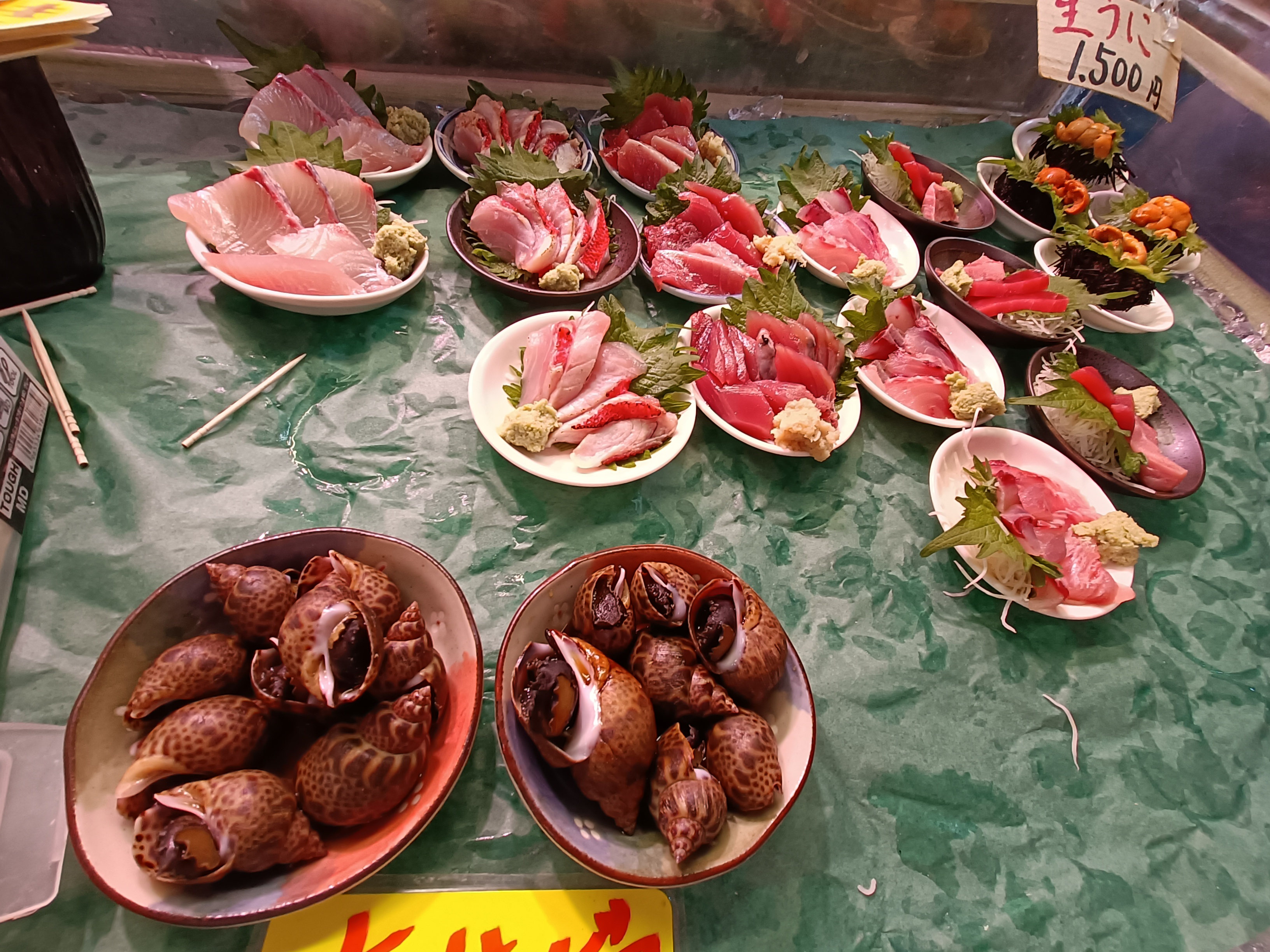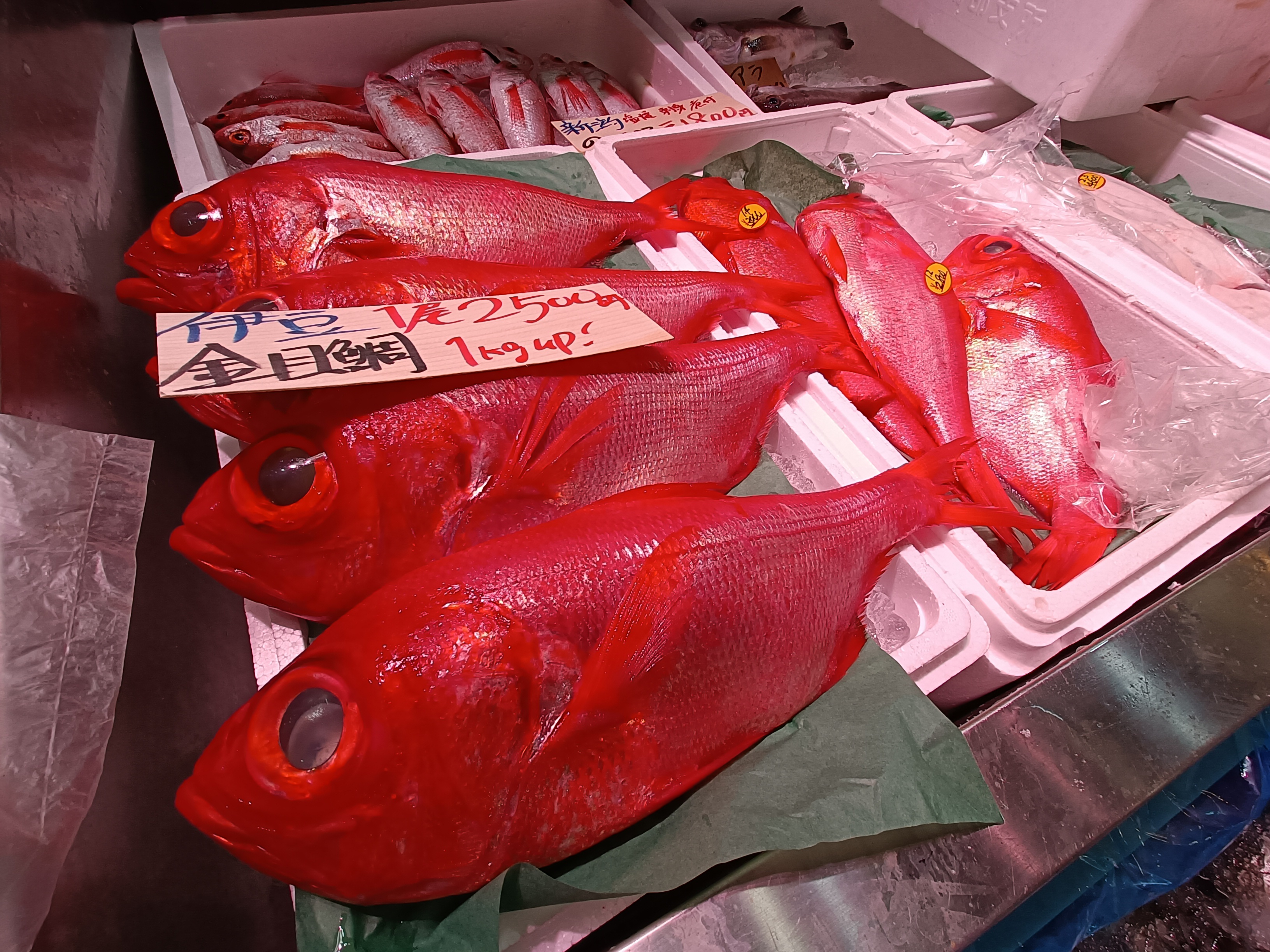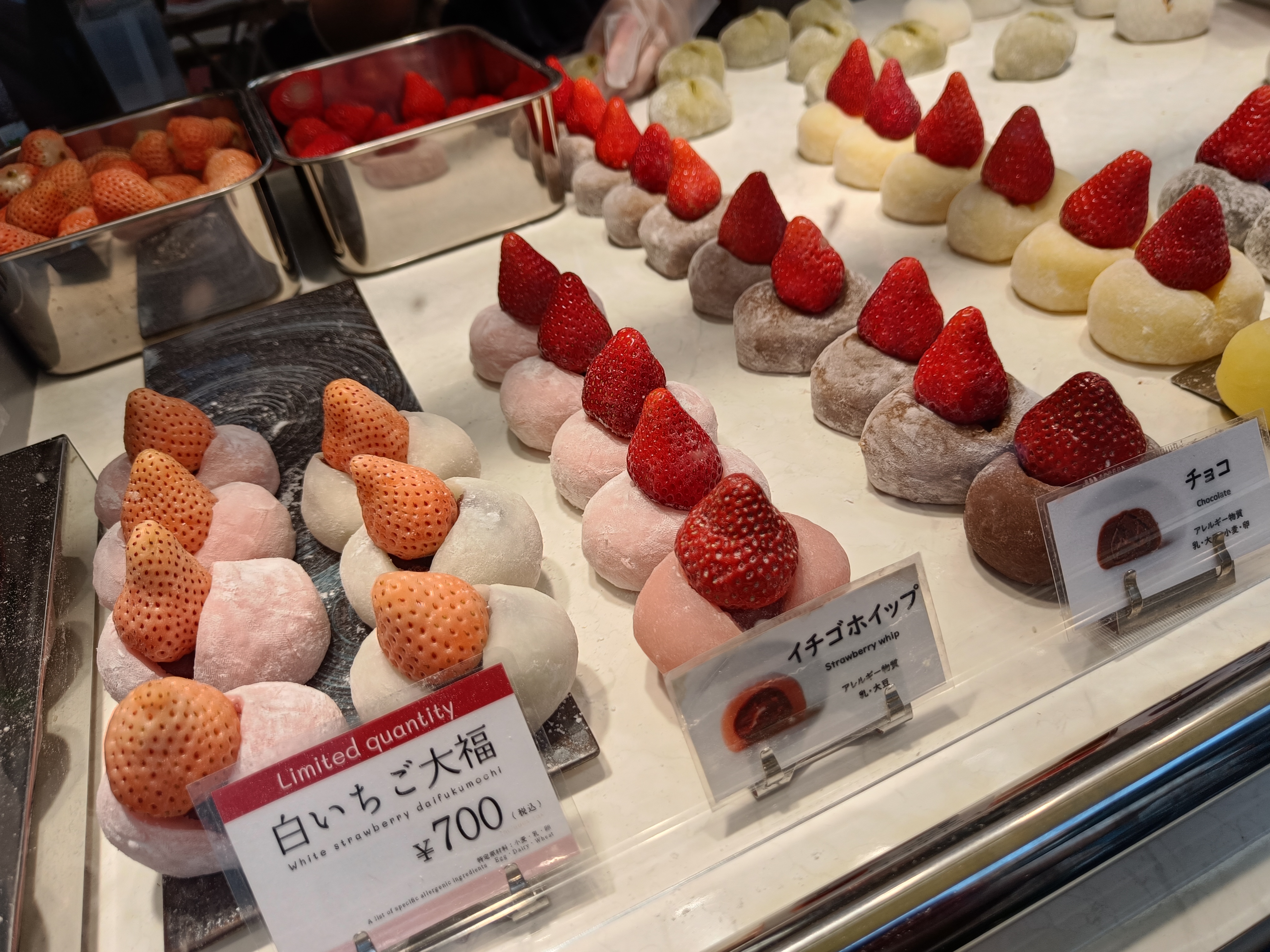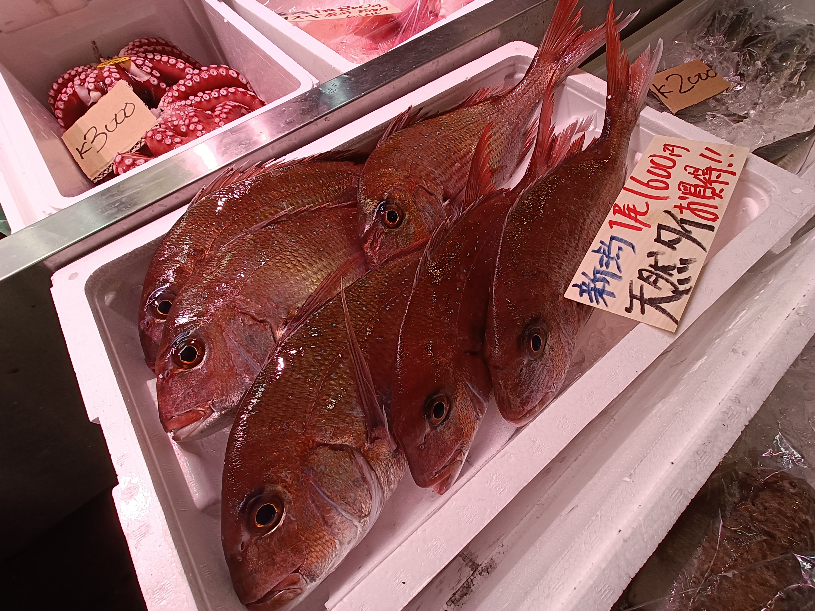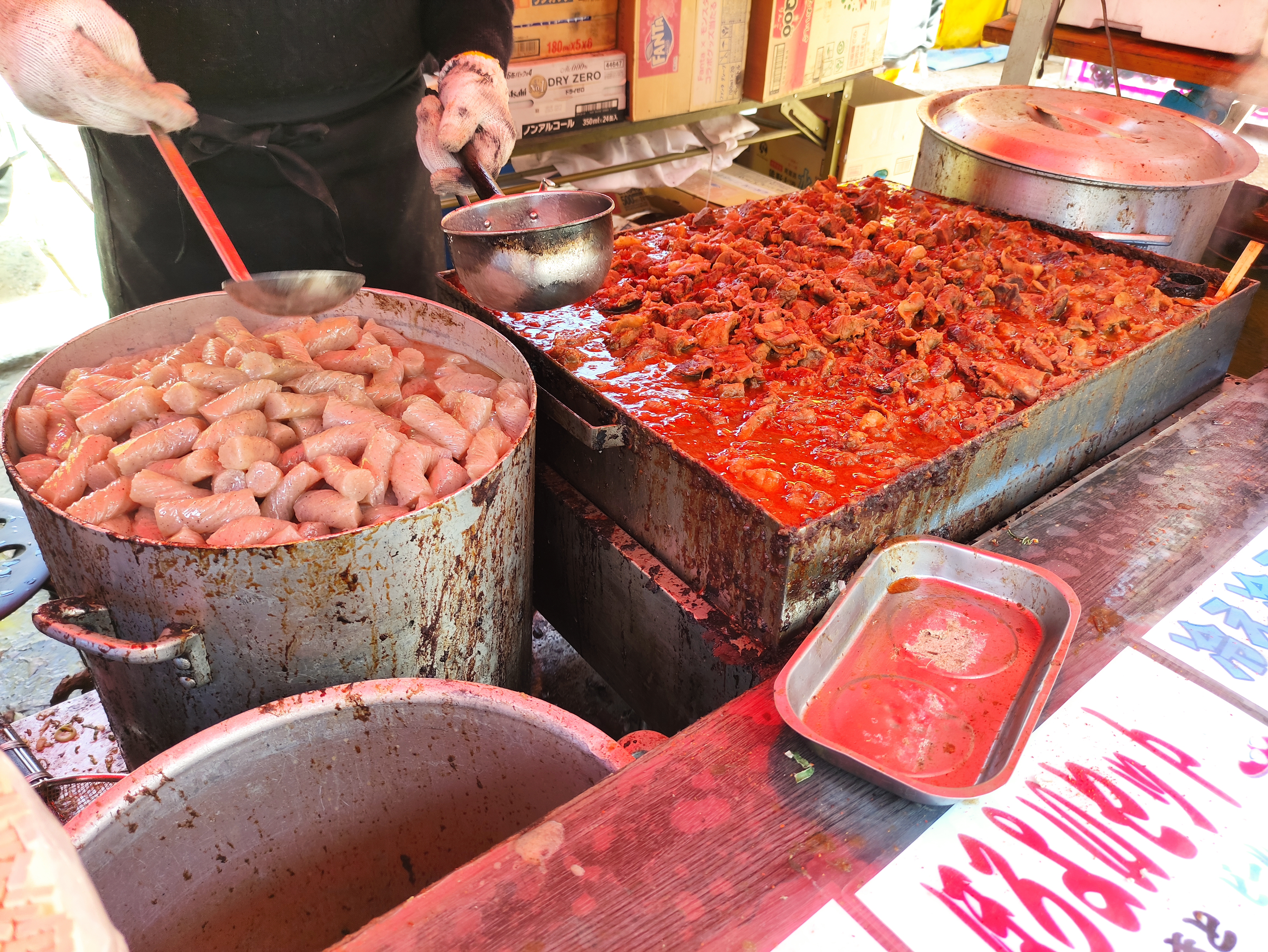 Anyhooooo, I digress – let’s get back to Tsujiki. Long story short, I spent a loooong time exploring here yesterday morning – and the below represents only a teeny tiny fraction of the several hundred pics I took in the process (when I said I liked markets, I seriously meant it…). As it was still breakfast time (at least in my book), I took the chance to try an amazake drink (a sweet, hot, non-alcoholic sake, which pretty much looked and tasted like hot, thin, sugary milk porridge) and grabbed a couple of white strawberry mochi (white strawberries being quite a ‘thing’ here) to set me up for the day – and I may well have to come back for a lunch or dinner round here before I go as well…!
