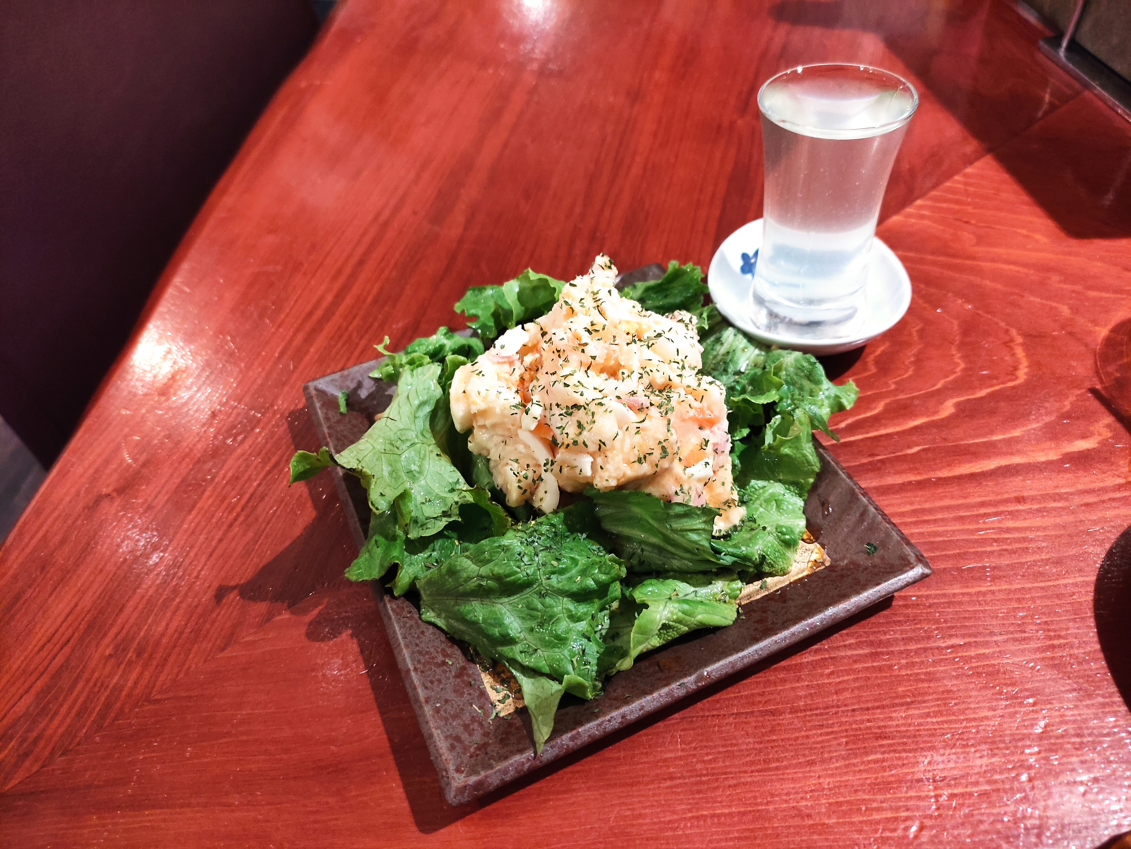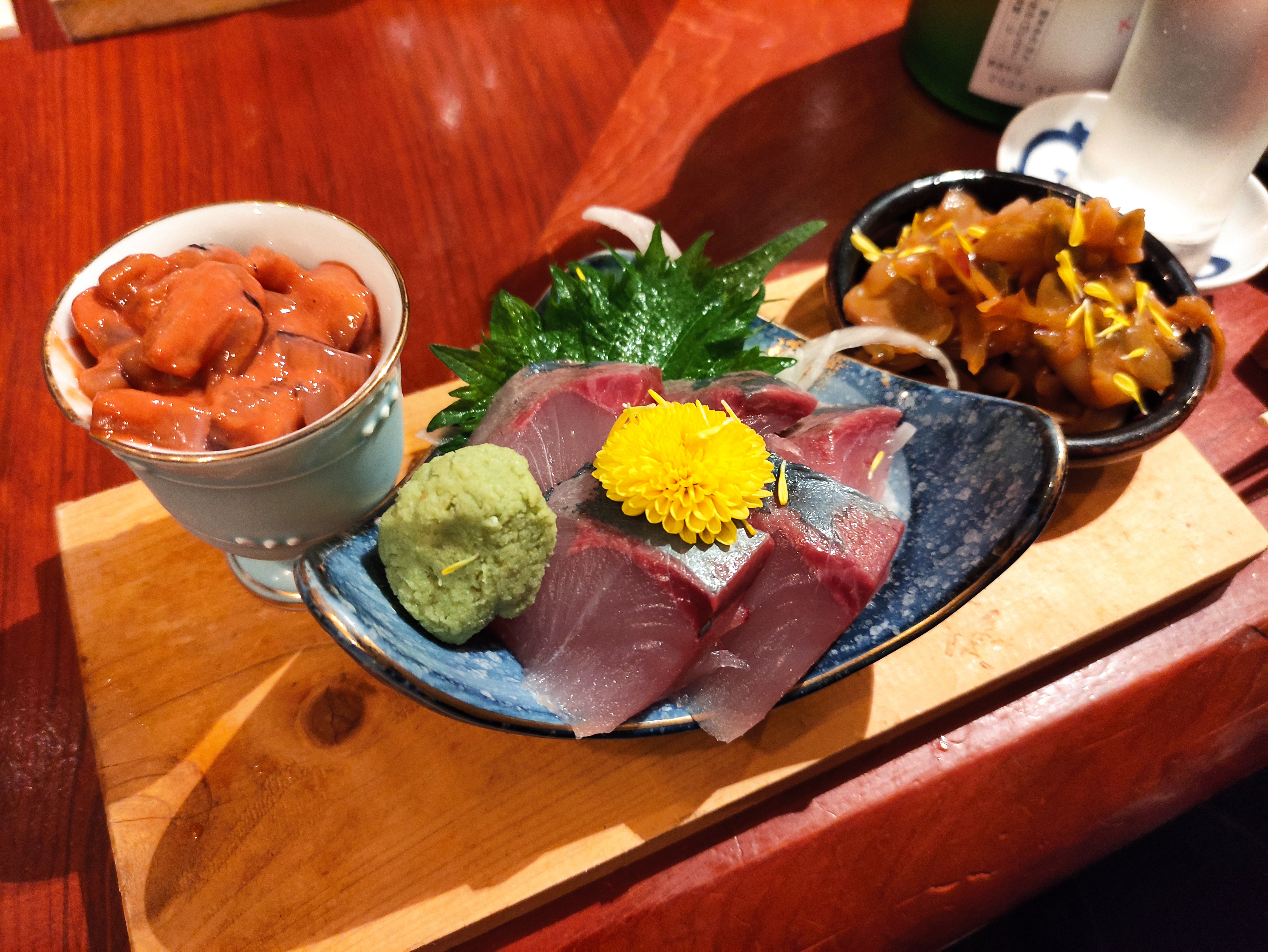But anyway, once again I digress. Back to some other recent examples of non-ramen based dining… I also got dinner the other night at a sake bar, where I ordered omakase (meaning chef’s choice – much easier when the menu is all in Japanese). The below was (I think) some squid in sauce, yellowfin sashimi and kim chi, followed by potato and egg salad and deep fried baby squid. All duly delicious, but I did have to get a couple of 7/11 rice balls on the way home again to properly fill the hole on this occasion! The first glass of sake also came free with the food, which (silly me, given the venue) I hadn’t been expecting. After the last 3 months off the sauce, I couldn’t manage more than a few sips without threatening to fall off my stool in the process.. Complete cheap date alert right here!